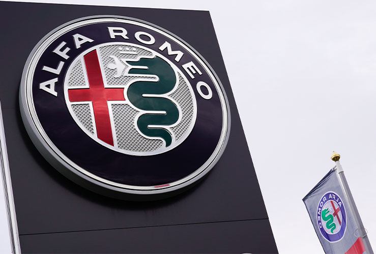 The Alfa Romeo badge is split vertically in two. The left half features the flag of Milan, the home of Alfa; a red cross on a white background. On the right is a serpent with a man emerging from its mouth, symbolising rebirth; the man is often mistaken for flames. There are other more controversial interpretations of the logo’s origins.